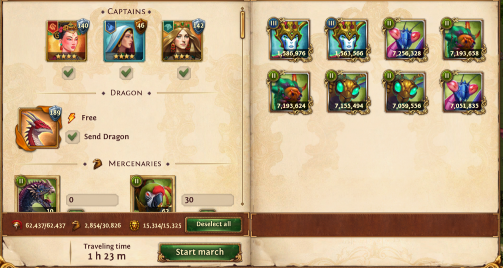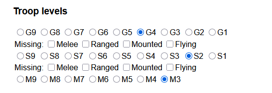 Under Troop levels, chose your highest troop available Guardsmen, Specialists, Monsters. You can also specify if you are missing any troop type research for both Guardsmen and Specialists.