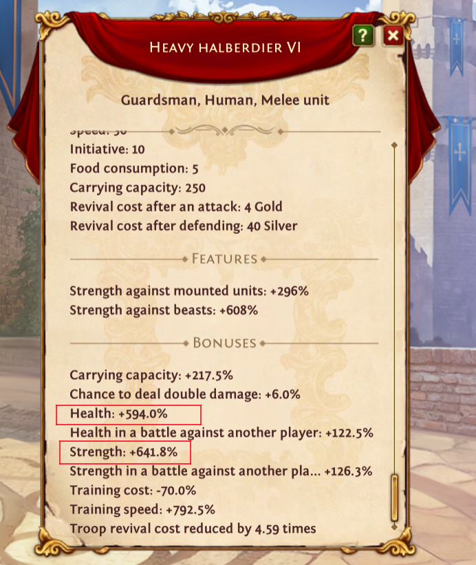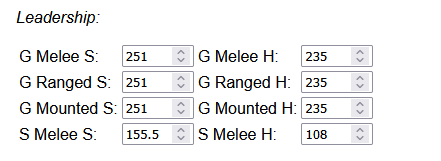 Under Leadership you want to enter Strength(S) and Health(H) bonuses for each Guardsmen type and Specialists Swordsmen. In troop selection window click on a unit to open its information and statistics