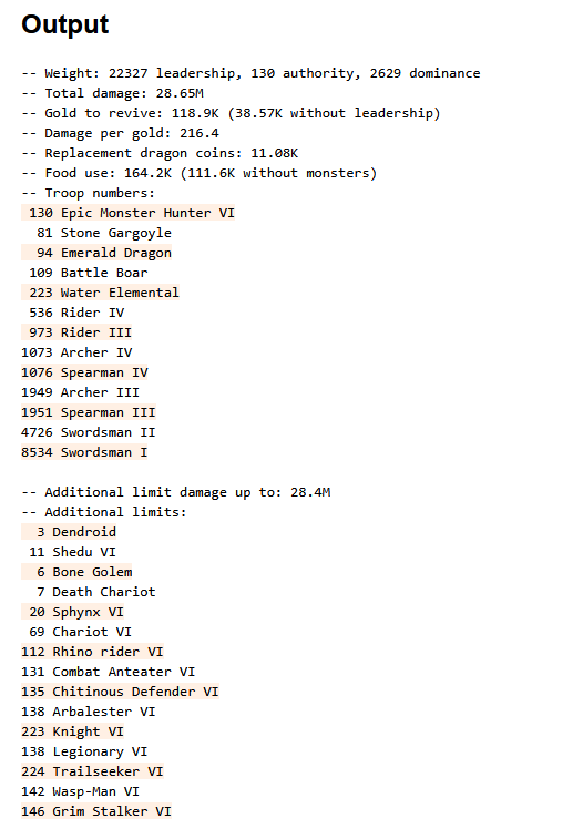 And this is what you will get. Use these exact number for best results. Lower part “Additional Lists” is a list of extra mercenaries, bought from Mercenary exchange, for extra damage.